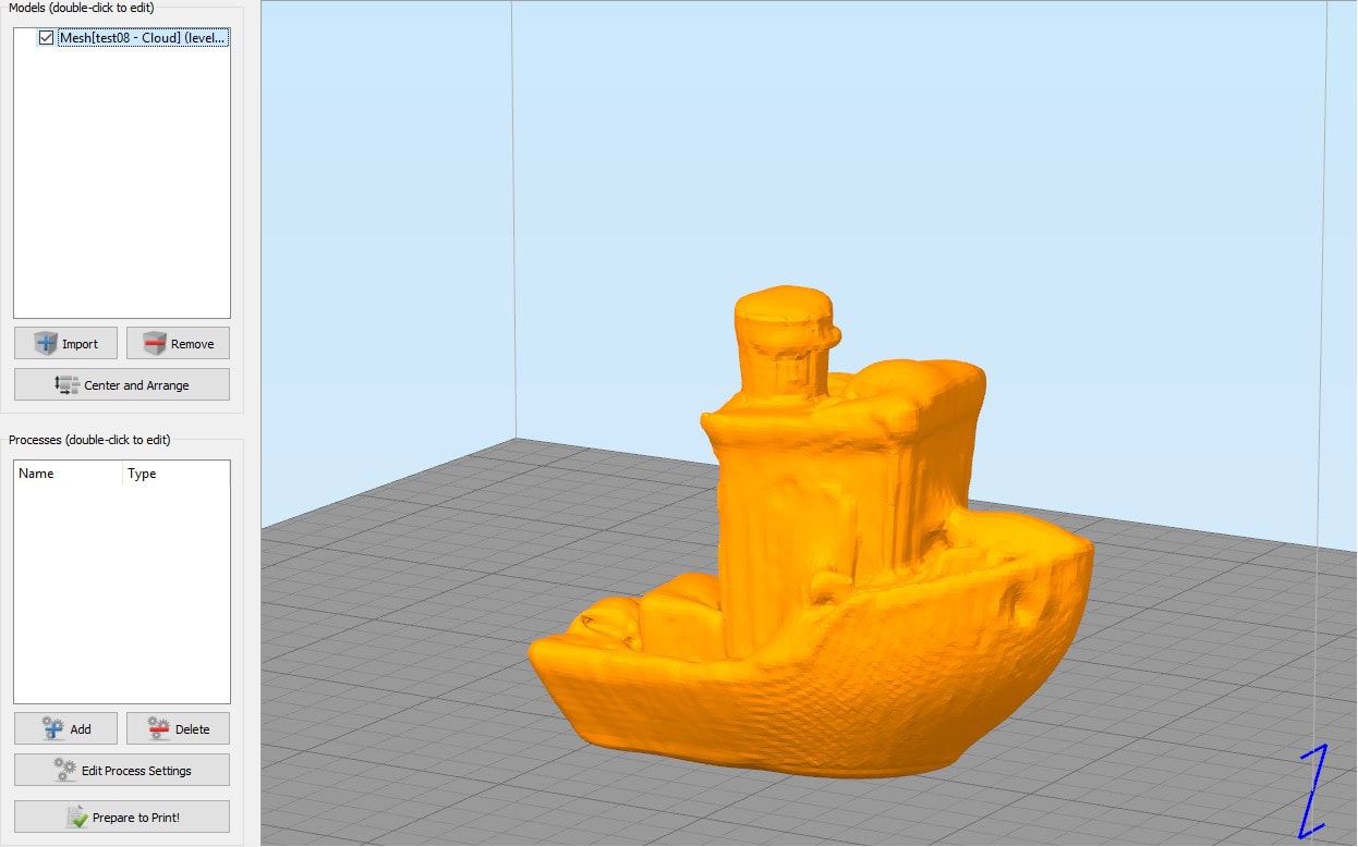Die in der BQ Anleitung vorgestellte Vorgehensweise zum errechnen der Normalen z.b. taugt vielleicht für den Totem aus dem Beispiel, geht aber z.b. bei einem gescannten Benchy komplett in die Hose, da muss man erst mal drauf kommen wo man da nun an welchen Einstellungen schrauben soll – ich hab bestimmt einen halben Tag gefummelt, bis ich überhaupt mal irgendein Ergebnis hatte, von „gut“ will ich gar nicht reden (siehe unten). Da darf man nicht ungeduldig sein. Und vor allem: das ist nur was für Leute, die Spass am Frickleln mit Softwareparametern haben. Das ist absolut kein Point & Click und ab zum Drucker damit.