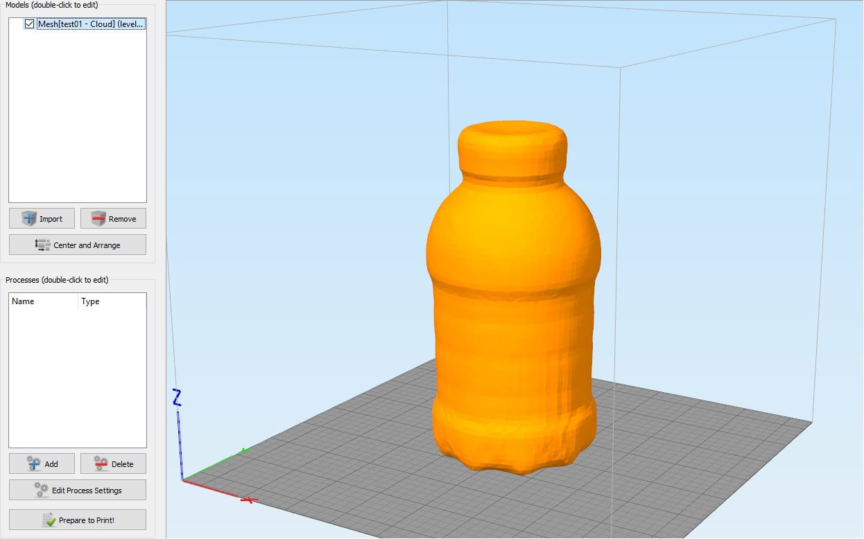 Eine Flasche Müllermilch. Den Scan finde ich echt gut, entspricht aber auch wie der Totempfahl aus der Anleitung dem, was ich als Ideal für diesen Scannertyp bezeichnen würde. runde tonnenartige Objekte ohne Überhänge.
