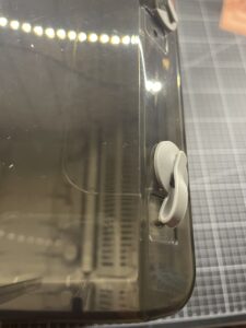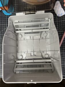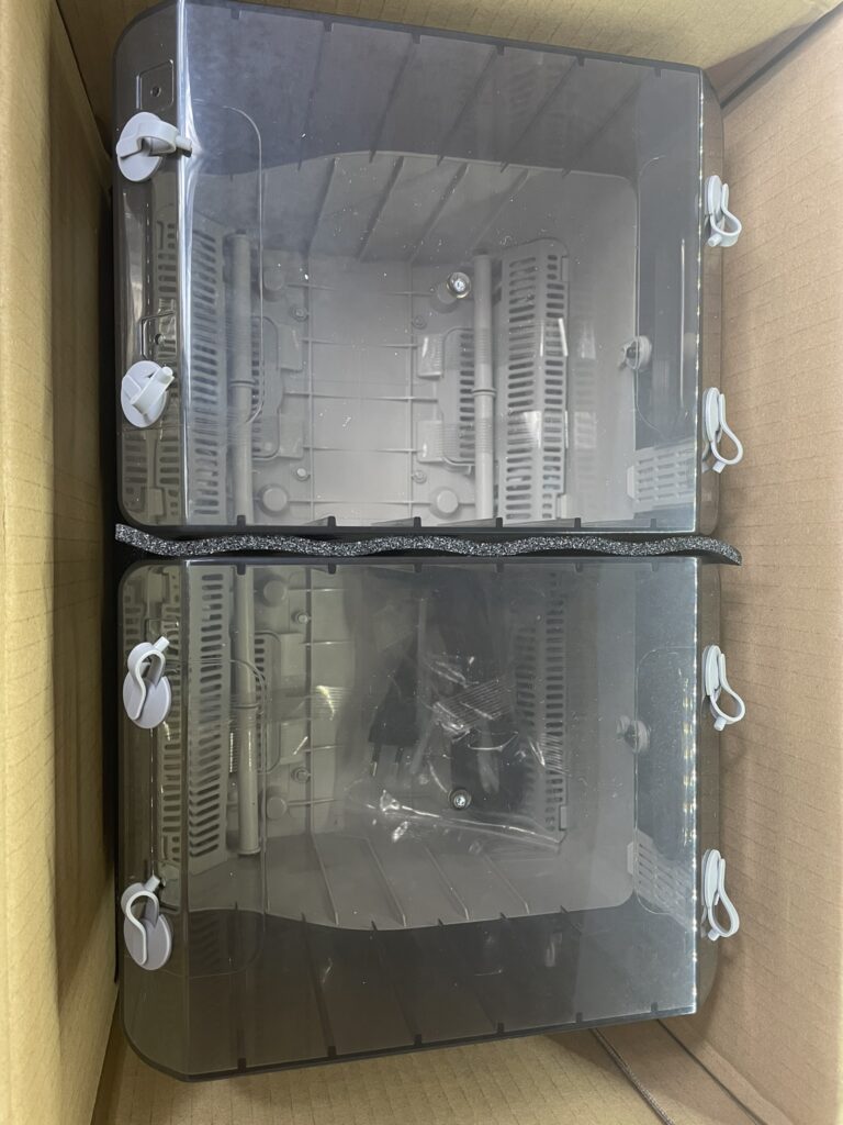Die Lösung: einfach Boxen umdrehen, sodass sie in die andere Richtung aufgehen. Funktioniert, ist aber nicht optimal, weil der Verschluss dann im schmalen Zwischenraum zwischen Drucker (oder Wand) und Trockenbox liegt. Für schmale Hände kein Problem, für größere könnte es eng werden.