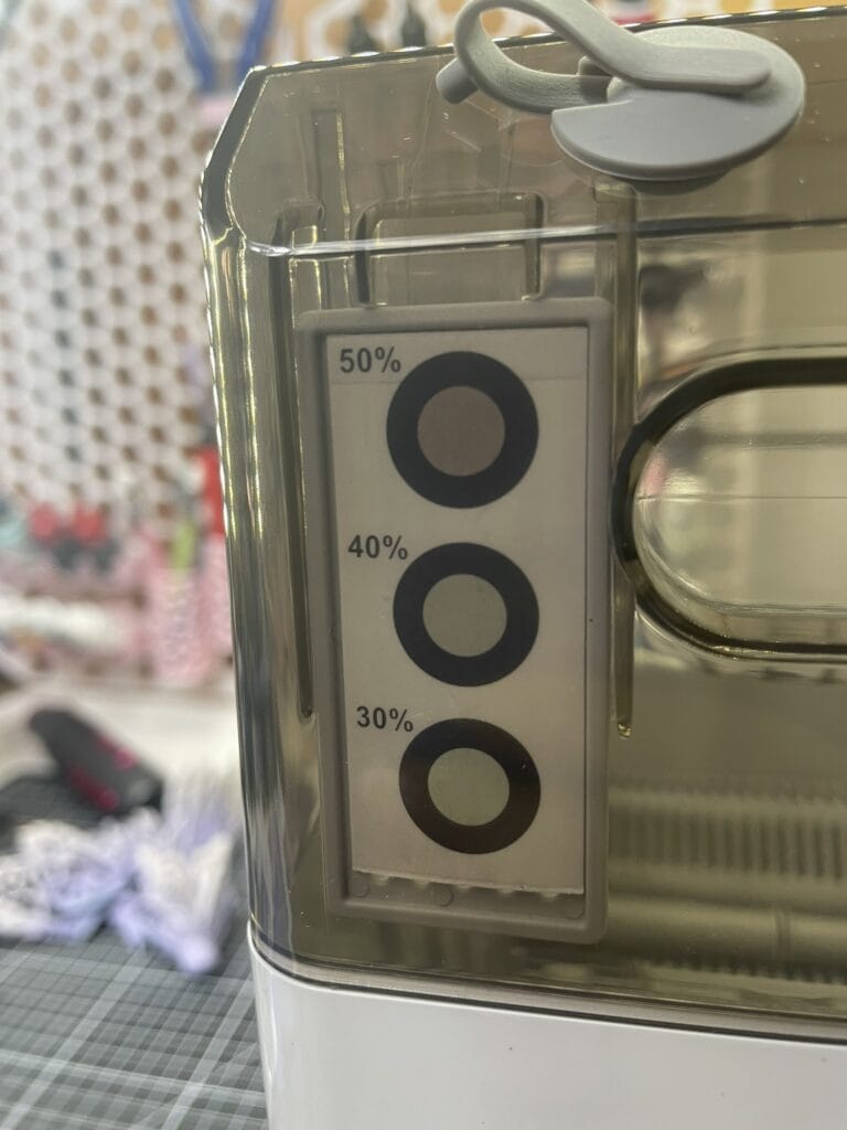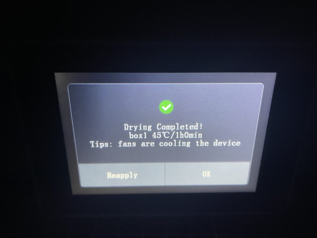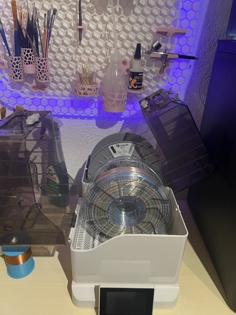 Praktisch finde ich auch, dass der Trockner automatisch reagiert, wenn sich die Luftfeuchtigkeit im Inneren wieder erhöht und dann automatisch zu trocknen beginnt. Somit besteht überhaupt keine Gefahr, dass Filament erst feucht werden kann.