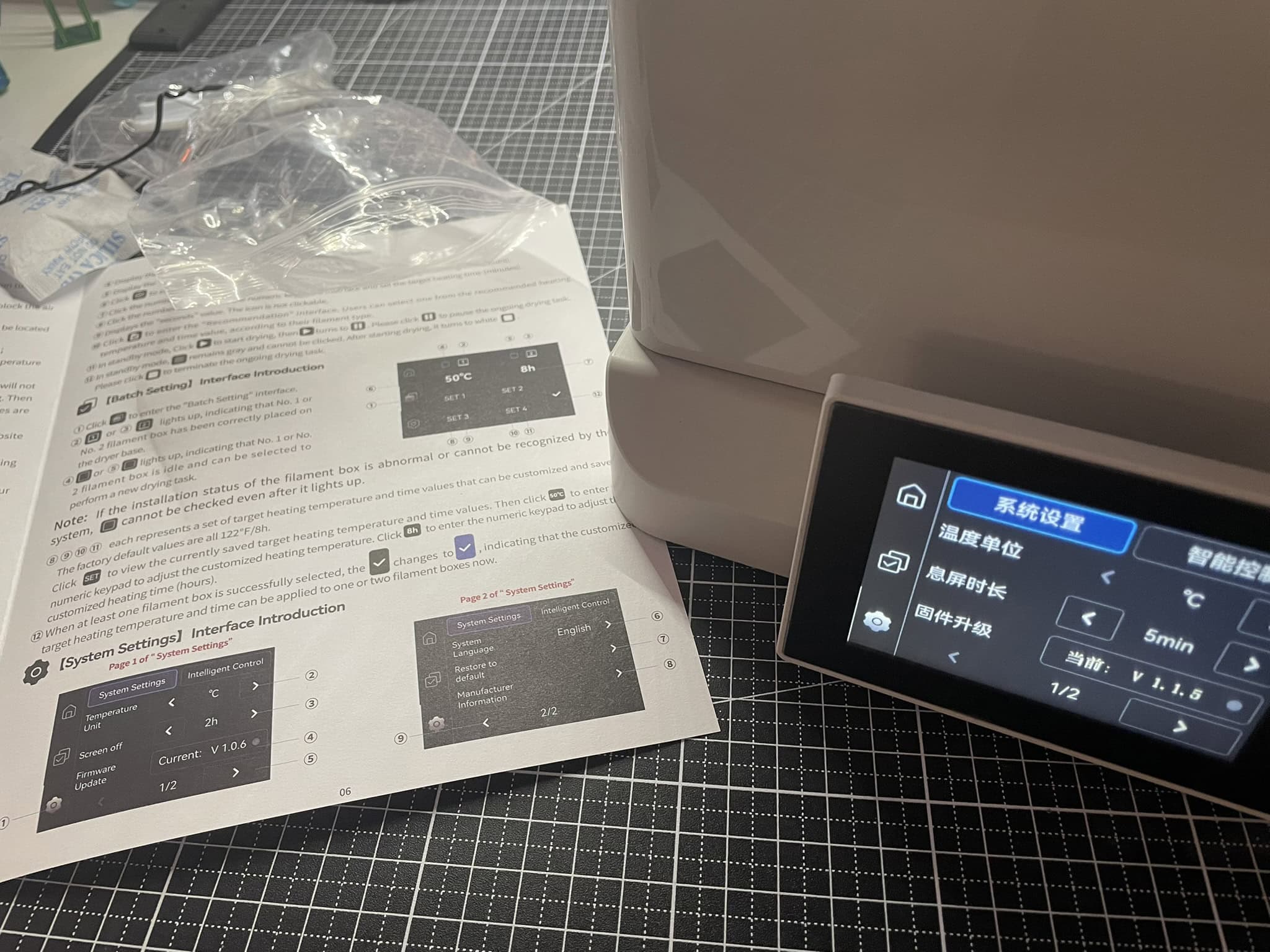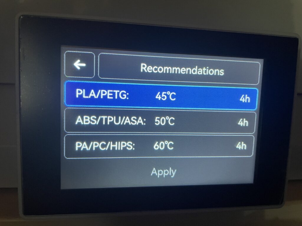 Gerade Einsteiger kennen oft noch nicht die idealen Temperaturen und Trocknungszeiten. Im Menü des E1 gibt es dafür eine kleine Vorauswahl mit gängigen Filamenttypen samt voreingestellter Temperatur und Zeit. Ein Klick reicht, und der Trocknungsprozess startet direkt.