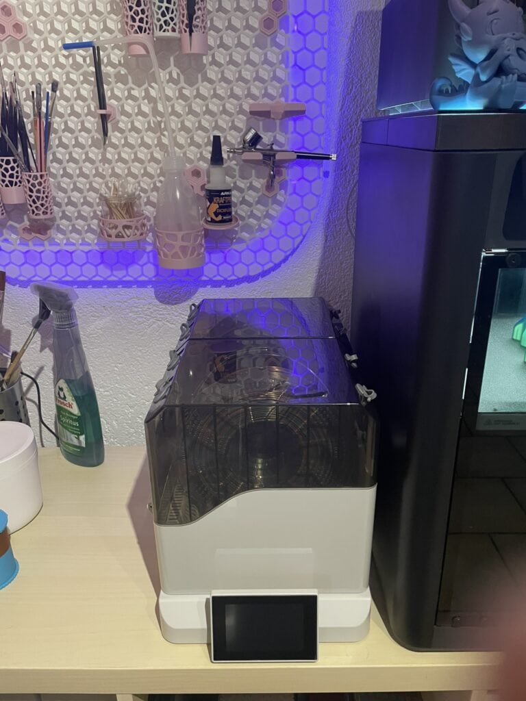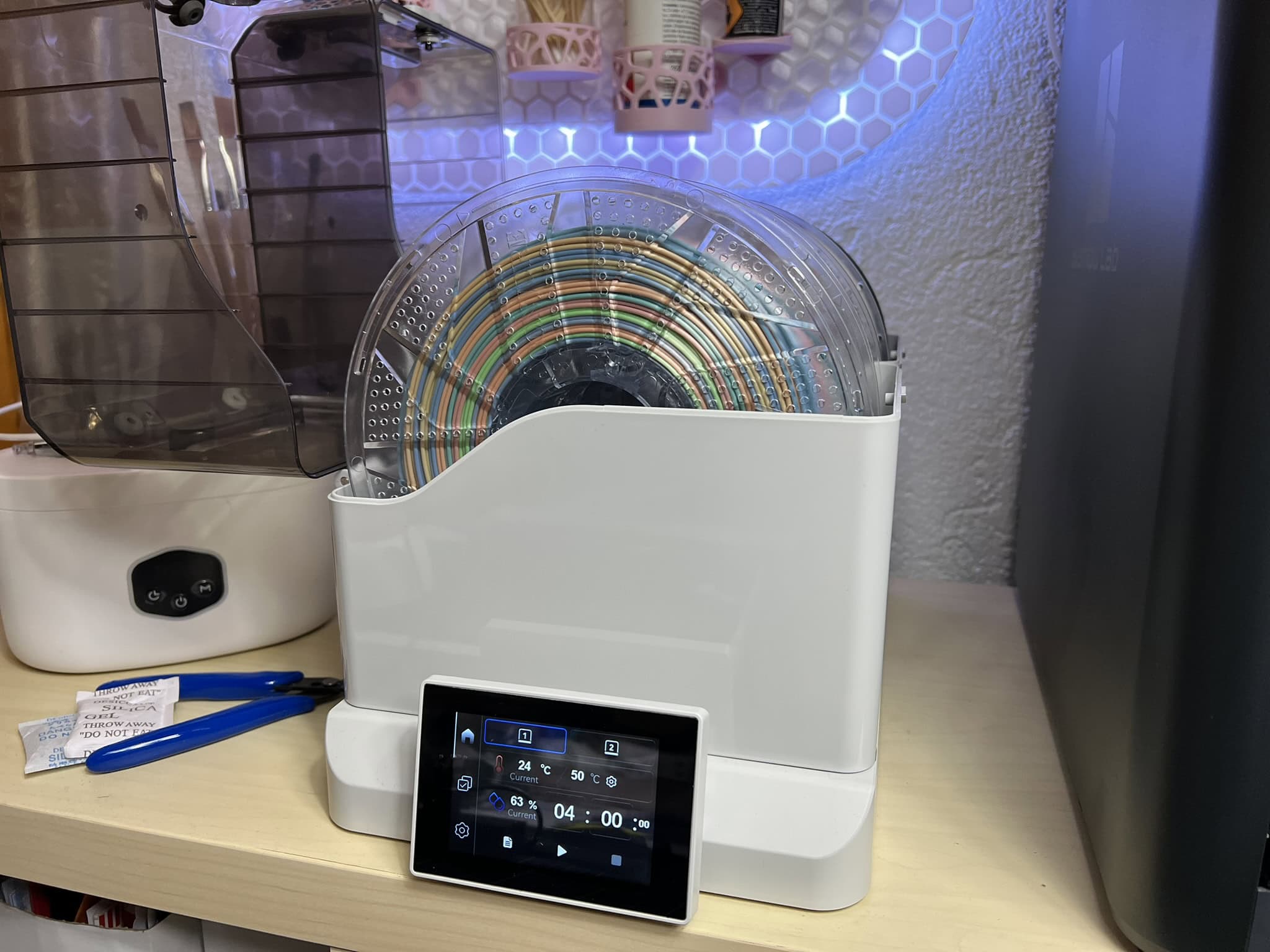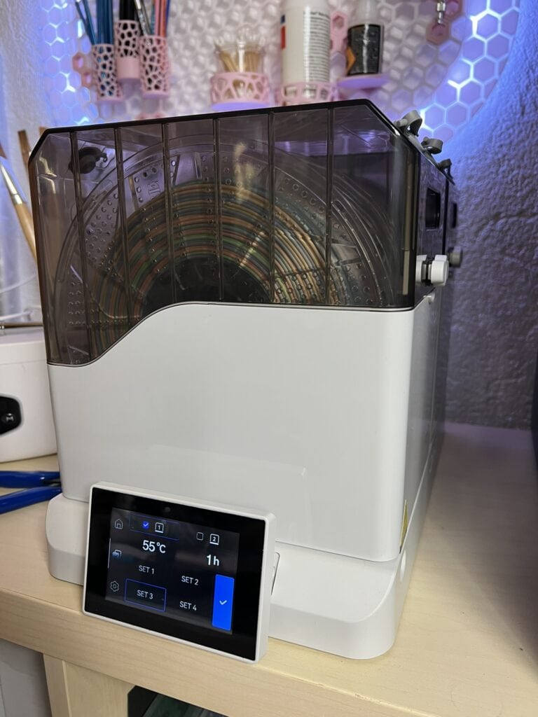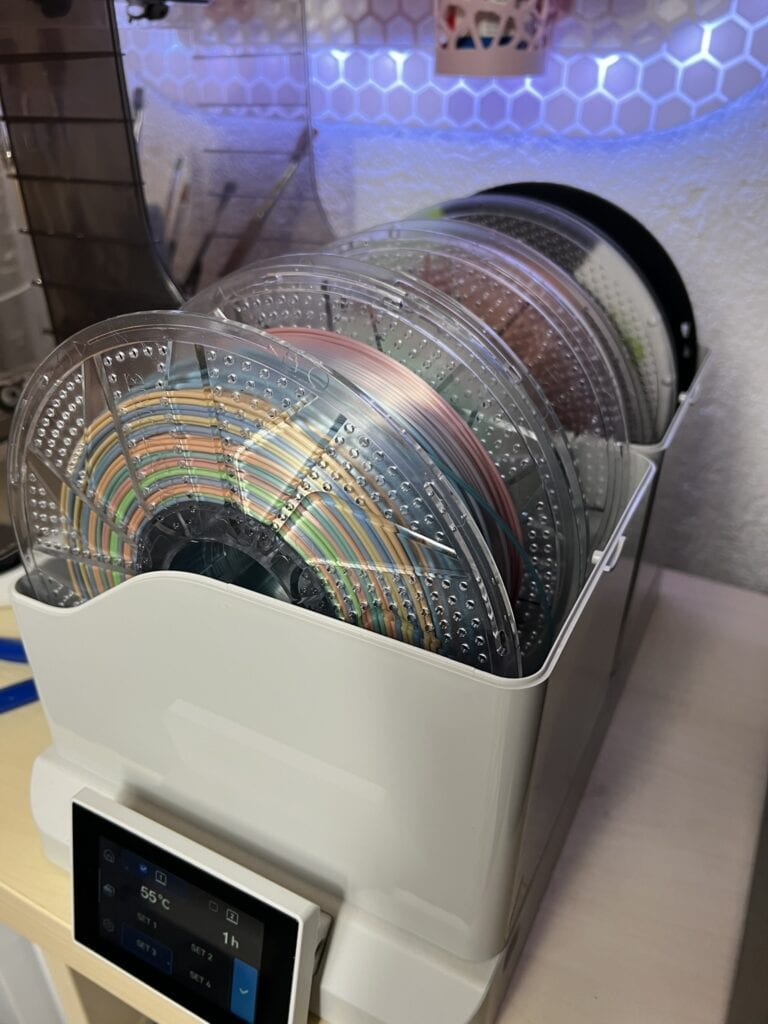 Viele schwärmen ja von der Sunlu S4. Für mich war sie aber immer etwas unpraktisch. Selten muss ich vier Rollen gleichzeitig trocknen, und wenn, dann wird bei der Sunlu der ganze Bauraum beheizt, selbst wenn man nur eine Rolle drin hat. Das ist nicht besonders effizient.