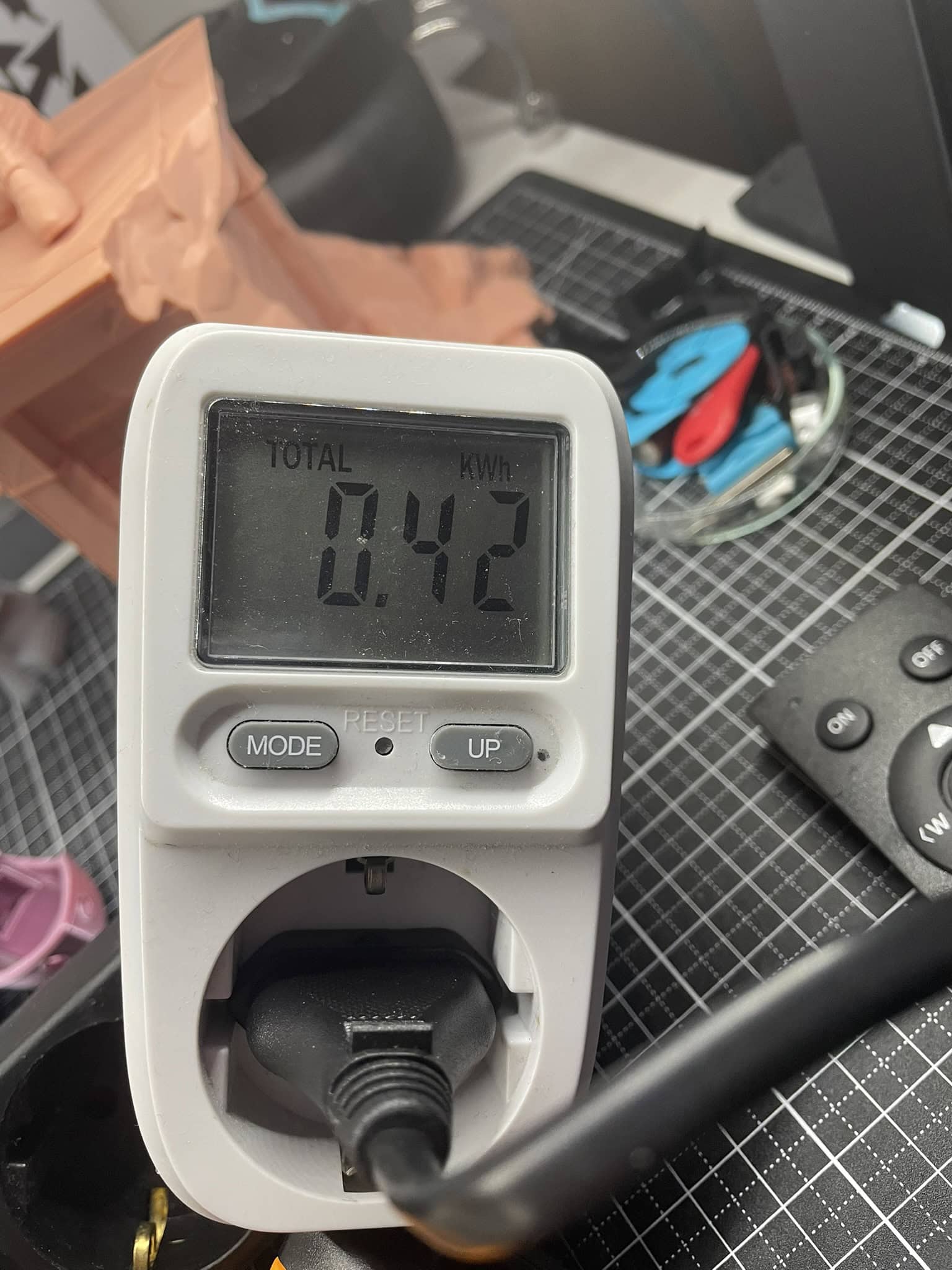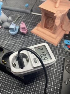 Den Stromverbrauch sollte man nicht unterschätzen: Pro Kammer zieht das Gerät bis zu 150 Watt – gemessen! Laufen also beide Seiten gleichzeitig in der Aufwärmphase, sind das knapp 300 Watt. Bei meiner Trocknung von ca. 5 Stunden für eine Kombi aus PLA und PETG kam ich insgesamt auf etwa 0,42 kWh. im Standby verbraucht das Gerät ca. 1W.
