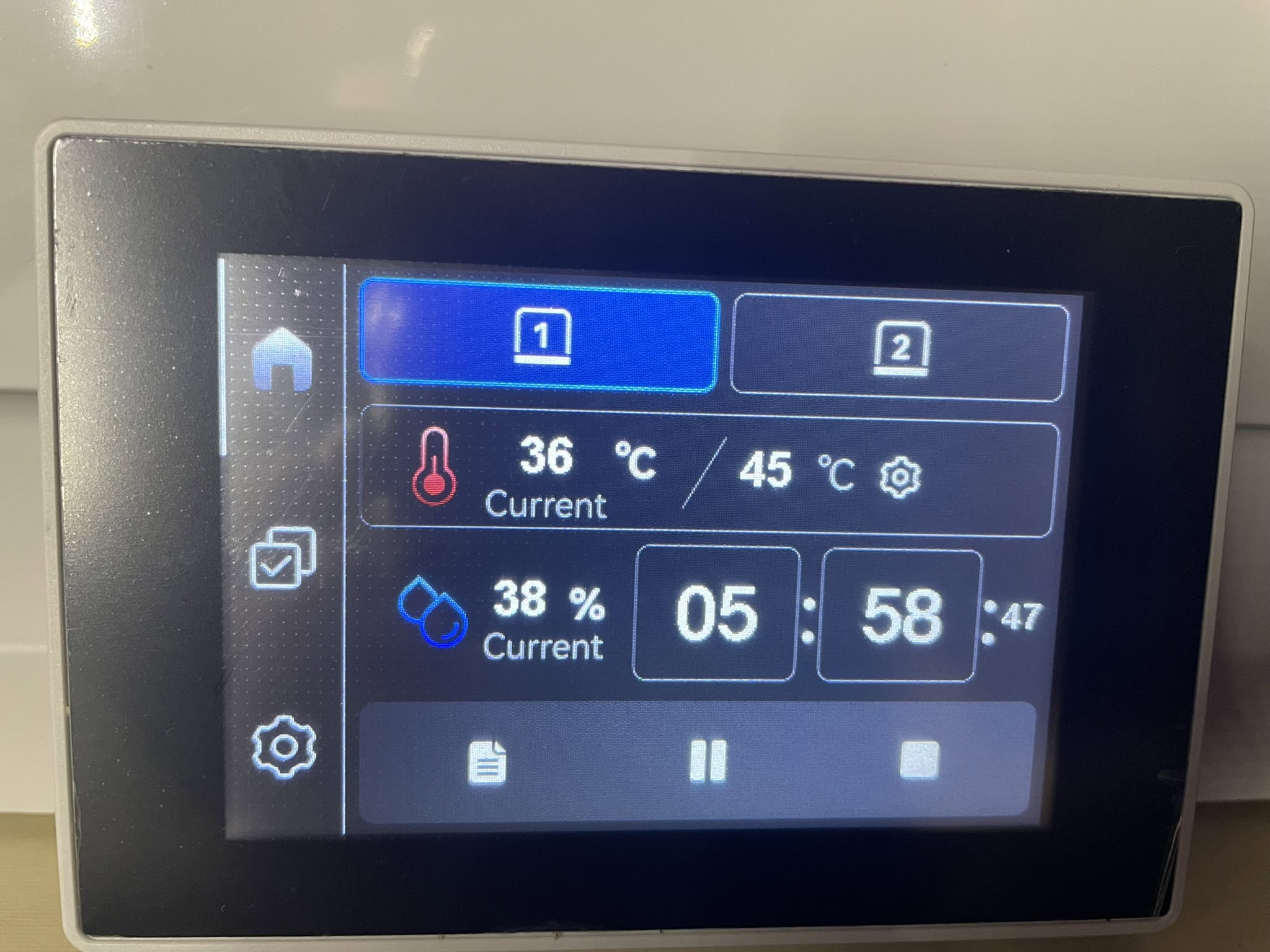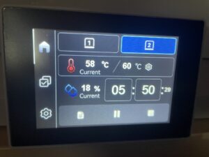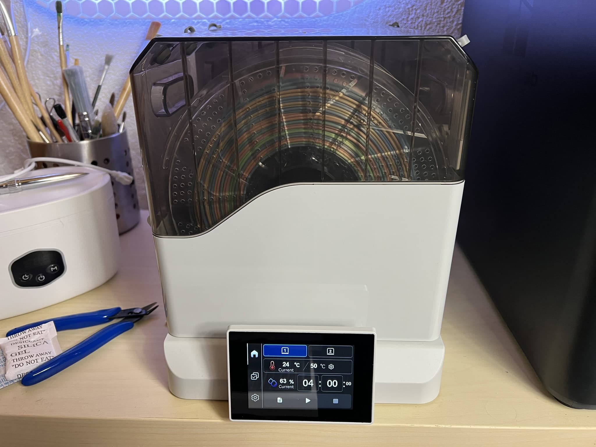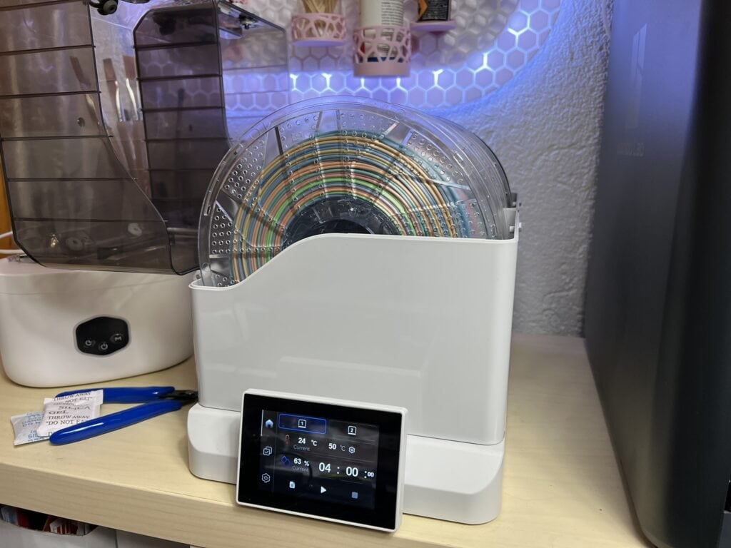 Besonders das Konzept mit den zwei separat steuerbaren Trocknungskammern gefällt mir ausgesprochen gut. Es erlaubt nicht nur das gleichzeitige Trocknen unterschiedlicher Materialien, sondern auch komfortable Lagerung. Im Vergleich zu meinem bisherigen Trockner, kommt das Filament hier am Ende tatsächlich trocken raus.