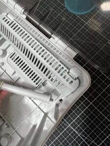 Das Display befindet sich an der Stirnseite, was leider auch die einzige Schwäche des Designs ist: Das Gerät quer hinstellen ist nur bedingt möglich, wenn man seitlich an das Display ran muss. Ich habe den Trockner deshalb längs direkt an meinen Drucker gestellt. Optisch ganz schick, aber leider kippen die Boxen nach hinten, sodass sie sich nicht mehr öffnen ließen.