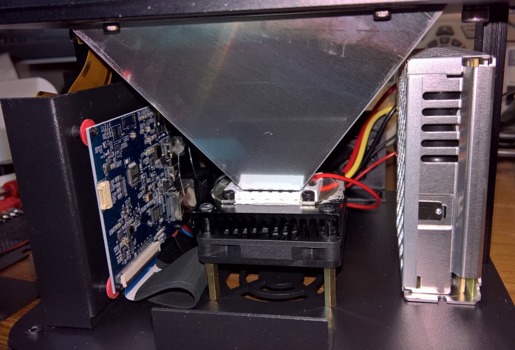 D7 von Innen: UV LED in der MItte, gekühlt von einem grottenschlechten 60mm Lüfter, Netzeil rechts und links das HDMI Board zu ansteuerung des Displays (Display wäre oben über dem silbernen Trichter, der als Reflektor für das UV Licht dient)
