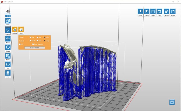 Man kann mit der XYZ Software eigene Supportstrukturen platzieren (Yay!) oder automatische Supports generieren lassen. Das Problem mit dem automatischen Support: die sind hirntot – und funktionieren auch nie so richtig. Schaut man mal, wie schlau Formlabs in Preform (der Formlabs Software) das Objekt ausrichtet und dann intelligent die Supports generiert und sieht dann wie stupide dagegen XYZ da einfach X Stützen pro cm hin ballert, dann merkt man schnell, dass der Preisunterschied auch eine Softwarefrage sein kann.