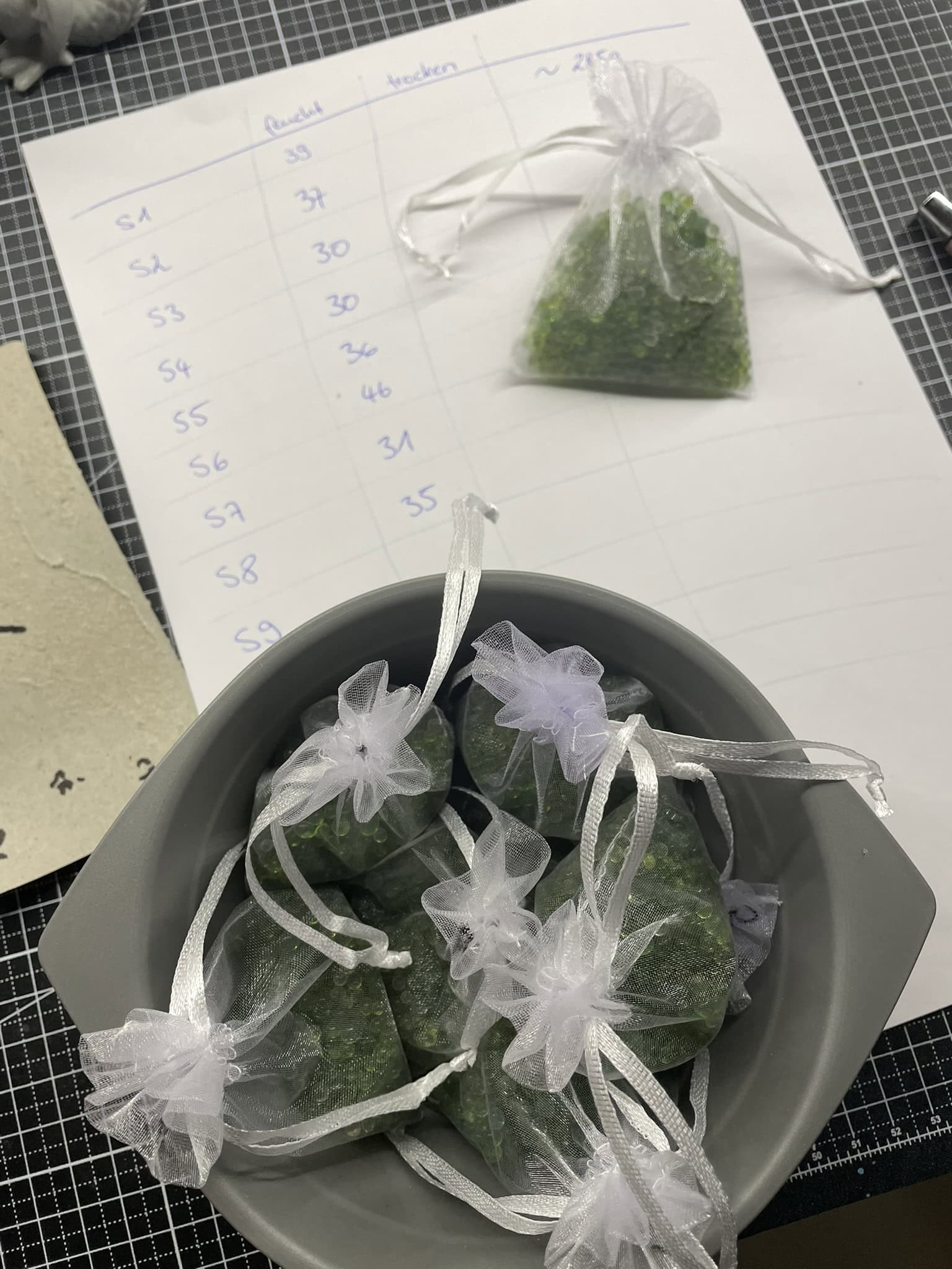 In meinem Fall habe ich 8 Säckchen (fast 300g) beschriftet und vor dem Trocknen gewogen (feucht = grün).