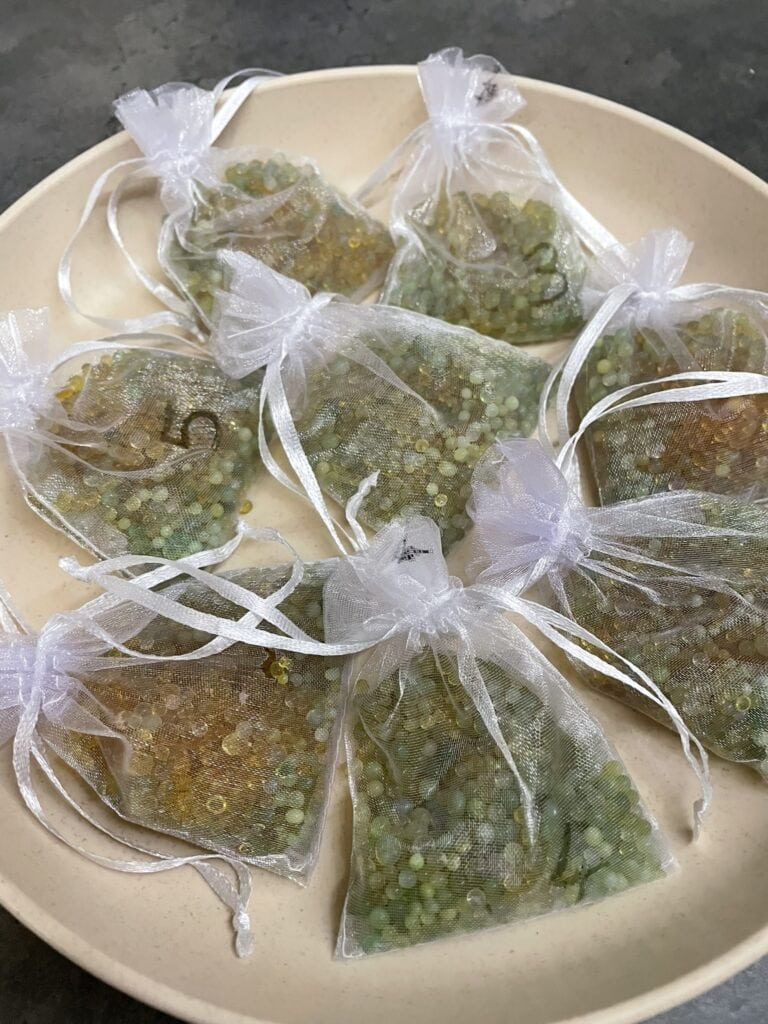 Ich verwende kleine Organzasäckchen (7x9cm), in die ich die Silica-Kugeln einfach einfülle.