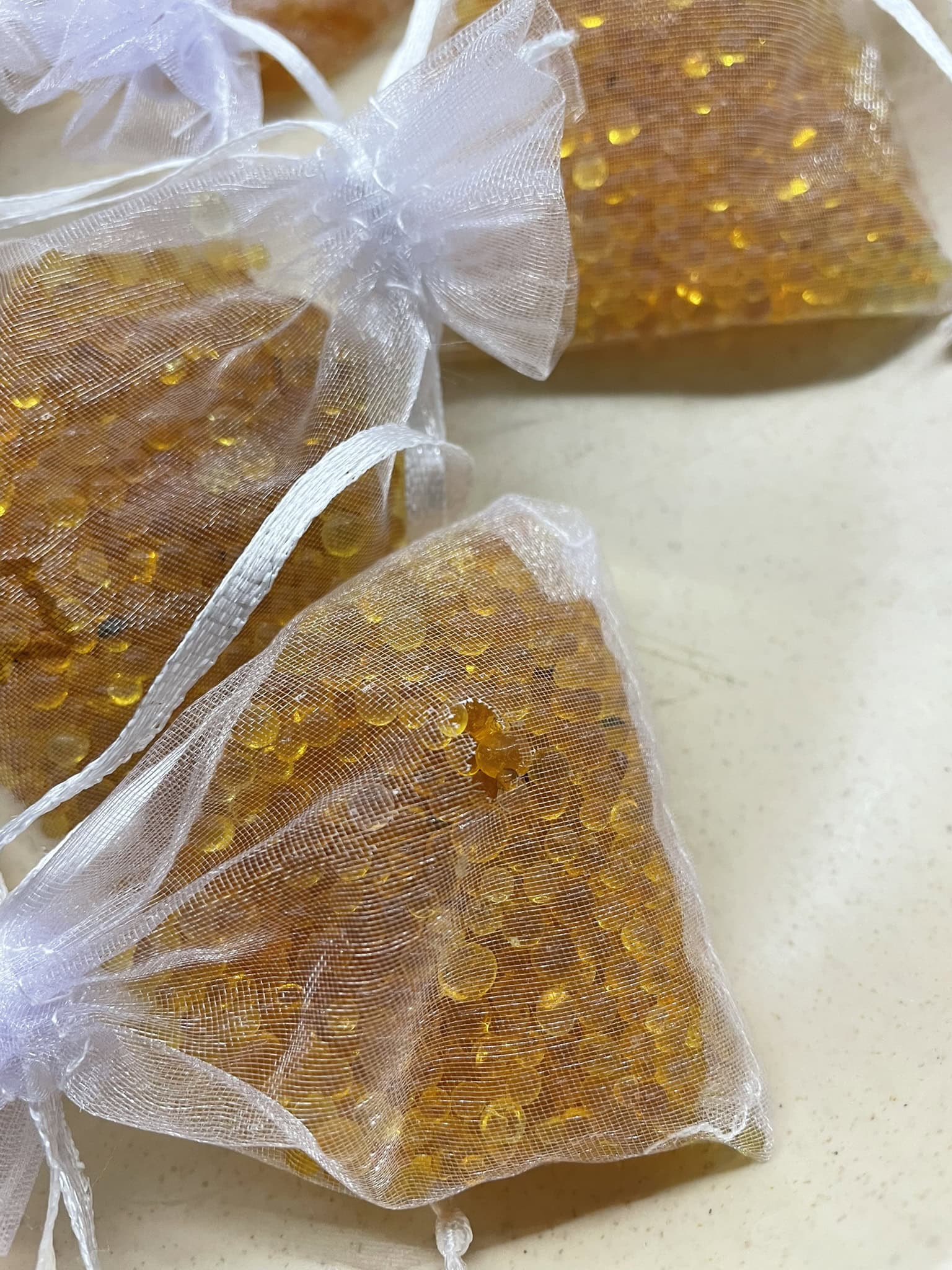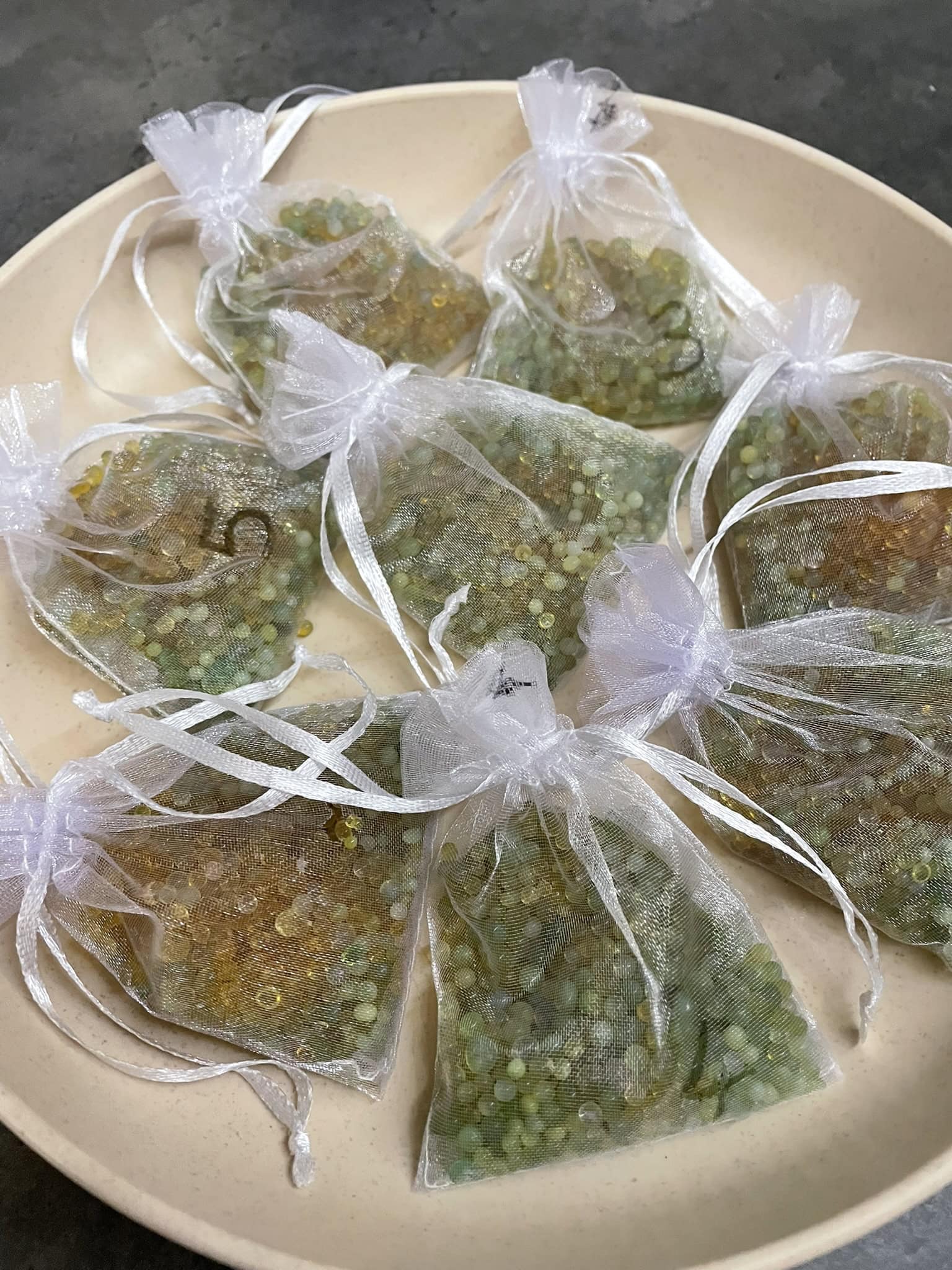 – beim ersten Versuch 3 Organza-Säckchen, Gesamtgewicht etwas über 300g auf Pastateller