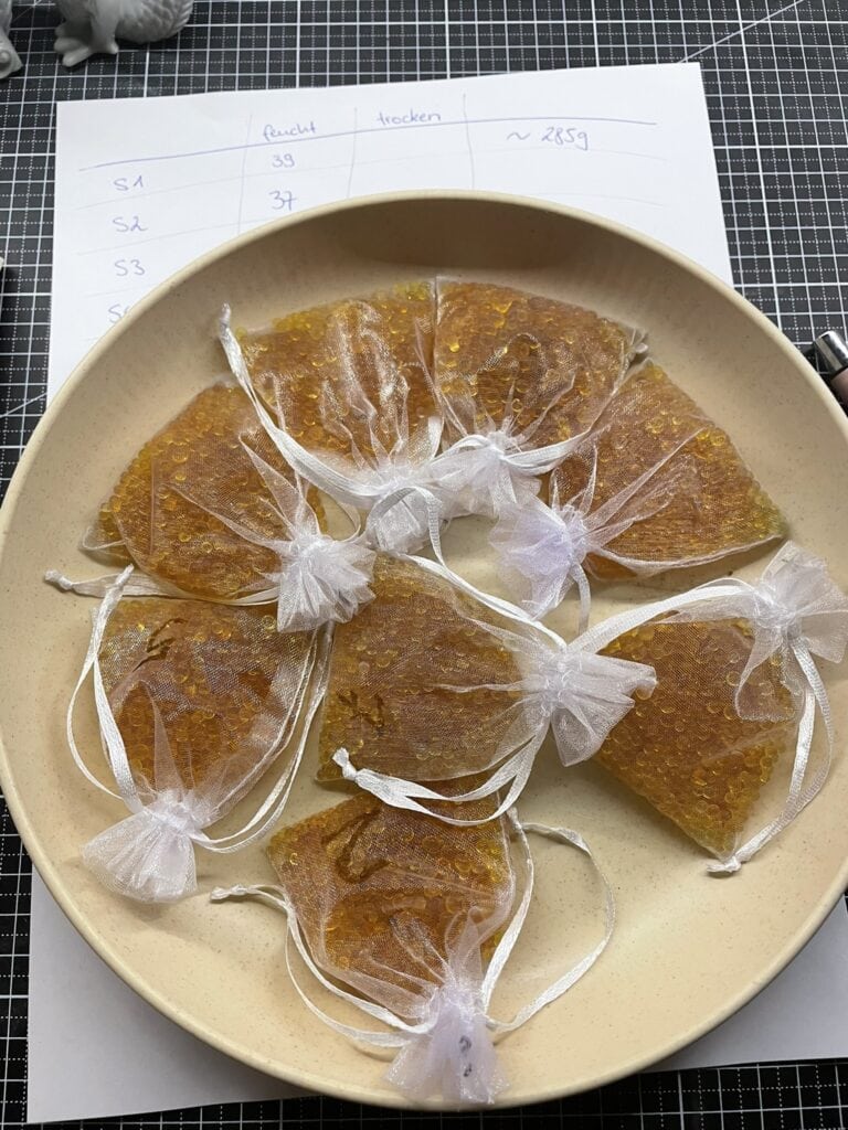 Ich kann mir vorstellen, dass es Perlen gibt, die mehr Feuchtigkeit aufnehmen können. Wenn man die ganzen Produktbeschreibungen liest, erzählen die einem immer etwas von 30-40% Feuchtigkeitsaufnahme im Vergleich zum Eigengewicht. Nun lagen, bevor ich den Test hier durchgeführt hatte, die Beutelchen allgemein noch paar Tage offen rum. Also noch gesättigter geht nicht.