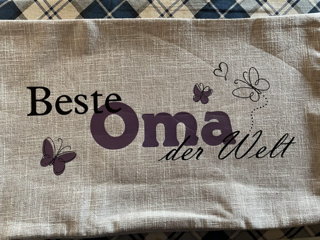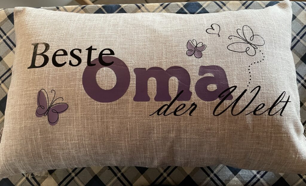Wie wäre es mit ein paar hübschen Kissenhüllen für die Großeltern? Natürlich lässt sich das Motiv auch ganz leicht abwandeln. Statt Oma und Opa passen ebenso Mama, Papa, Schwester/Bruder/Freundin oder wer auch immer beschenkt werden soll. Und anstatt einer Kissenhülle können wir auch T-Shirts, Einkaufsbeutel oder andere Sachen nehmen.