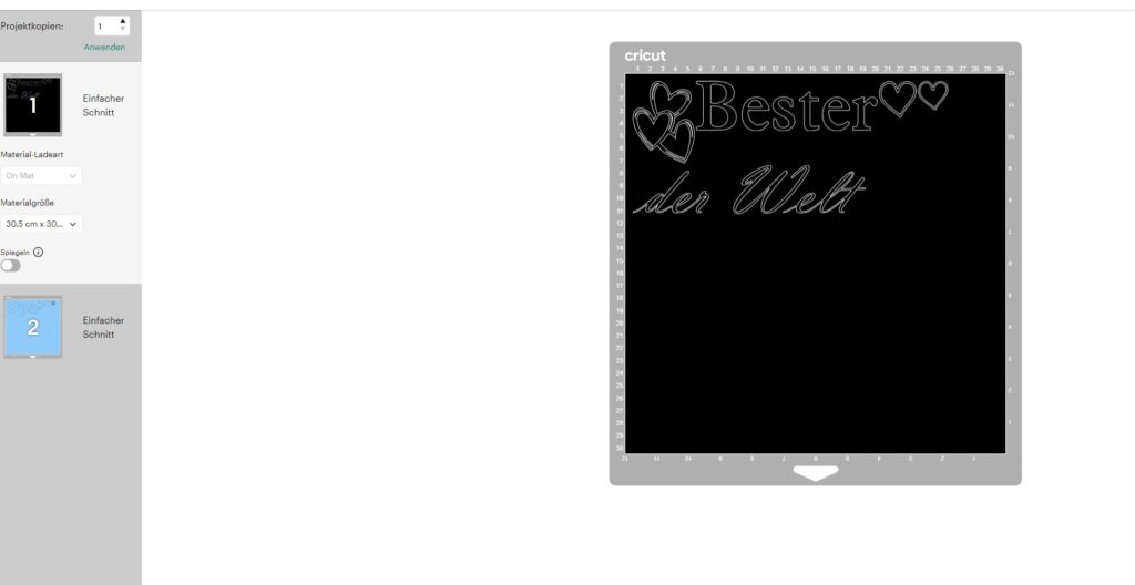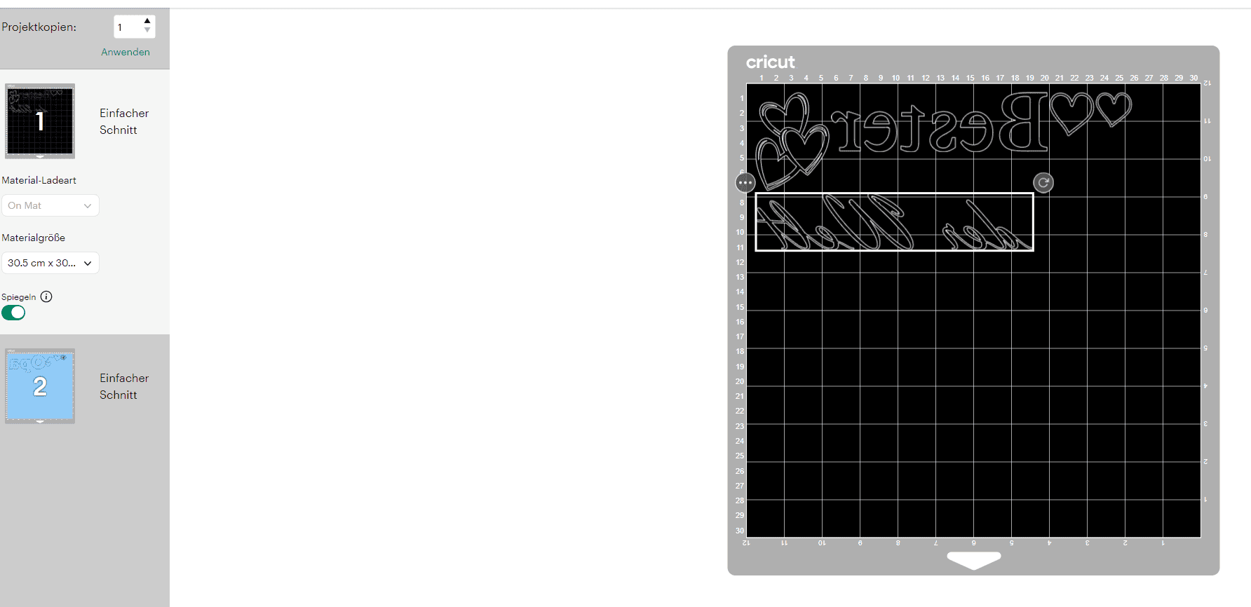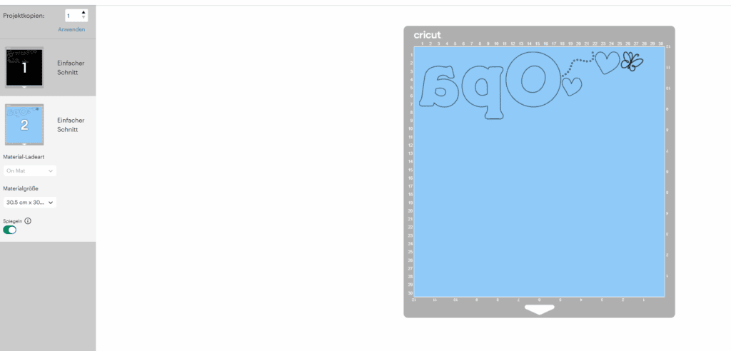 Und ich kann es gar nicht oft genug betonen: SPIEGELN nicht vergessen! Bei Bügelbildern muss gespiegelt werden, weil die Folie später kopfüber auf den Stoff kommt. Damit das Motiv am Ende richtig herum sichtbar ist, muss es also verkehrt herum geplottet werden. Im Cricut Design Space lässt sich das während der Herstellungsübersicht einfach über die Option ‚Spiegeln‘ einstellen. In anderen Programmen muss man das oft schon direkt im Arbeitsbereich erledigen.