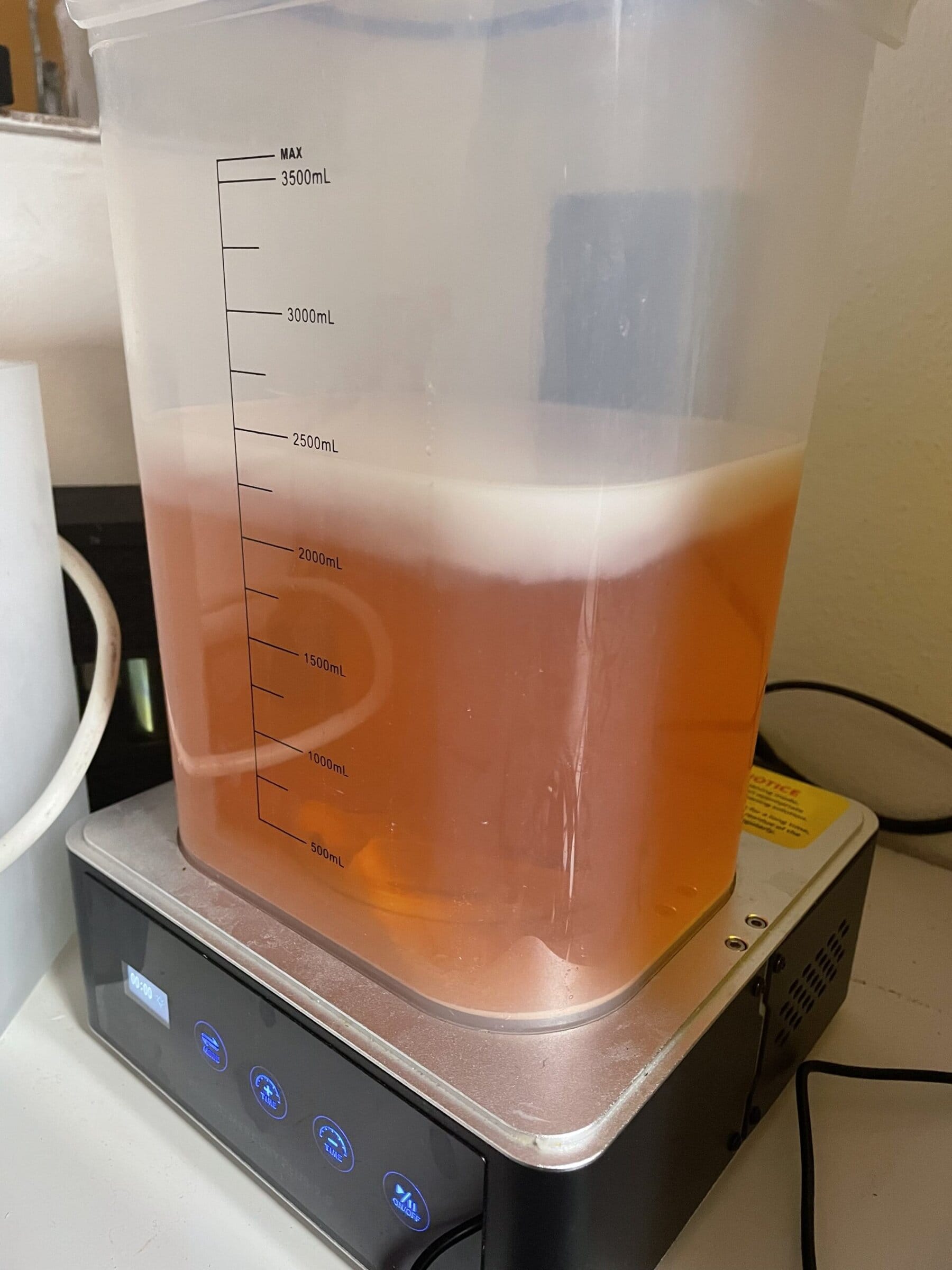 Nach ein paar Tagen stellt ihr den Behälter vorsichtig auf eure Curing-Station. Achtet darauf, das abgesetzte Resin nicht zu stark aufzuwirbeln.