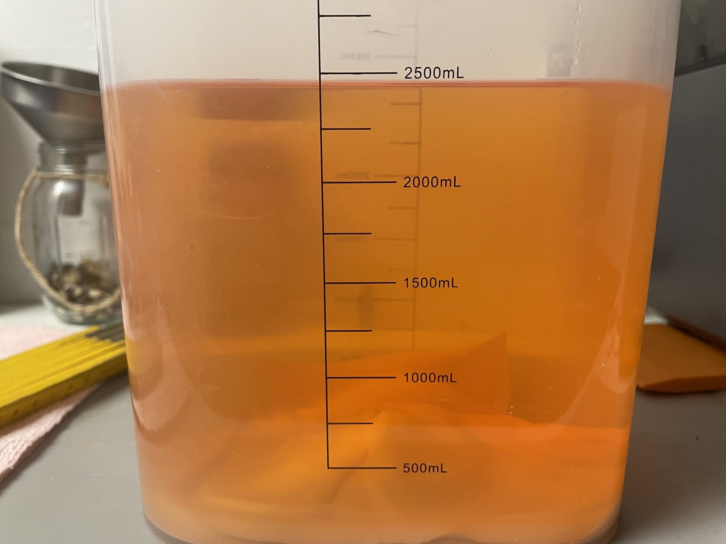 Vorsichtig gieße ich den oberen Teil nun langsam entweder in den zweiten Wascheimer oder ein anderes Gefäß um. Achtet hierbei auf eine gute Belüftung. Ich verschiebe diesen Prozess immer auf die Abendstunden ohne UV Licht und gehe damit nach draußen.