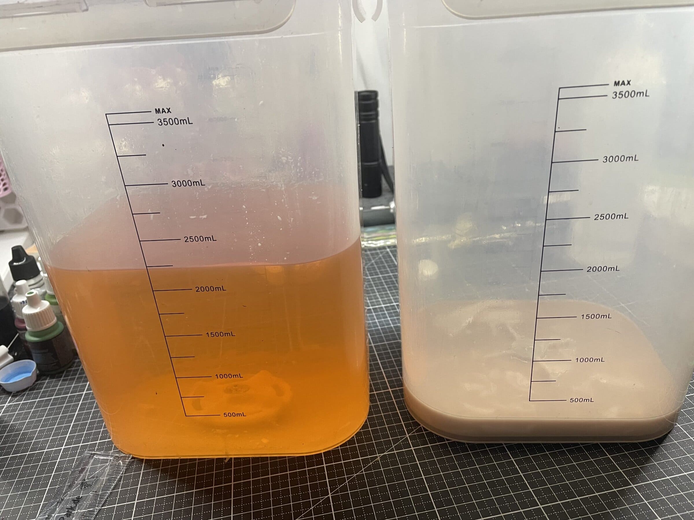 Sobald sich das Resin abgesetzt hat, kann man deutlich sehen, dass oben klares Iso übrigbleibt. Es ist oft verfärbt, aber völlig durchsichtig. Wobei rotes und beiges Resin sehr viel stärker verfärben wie man sieht. Graues dagegen fast gar nicht.
