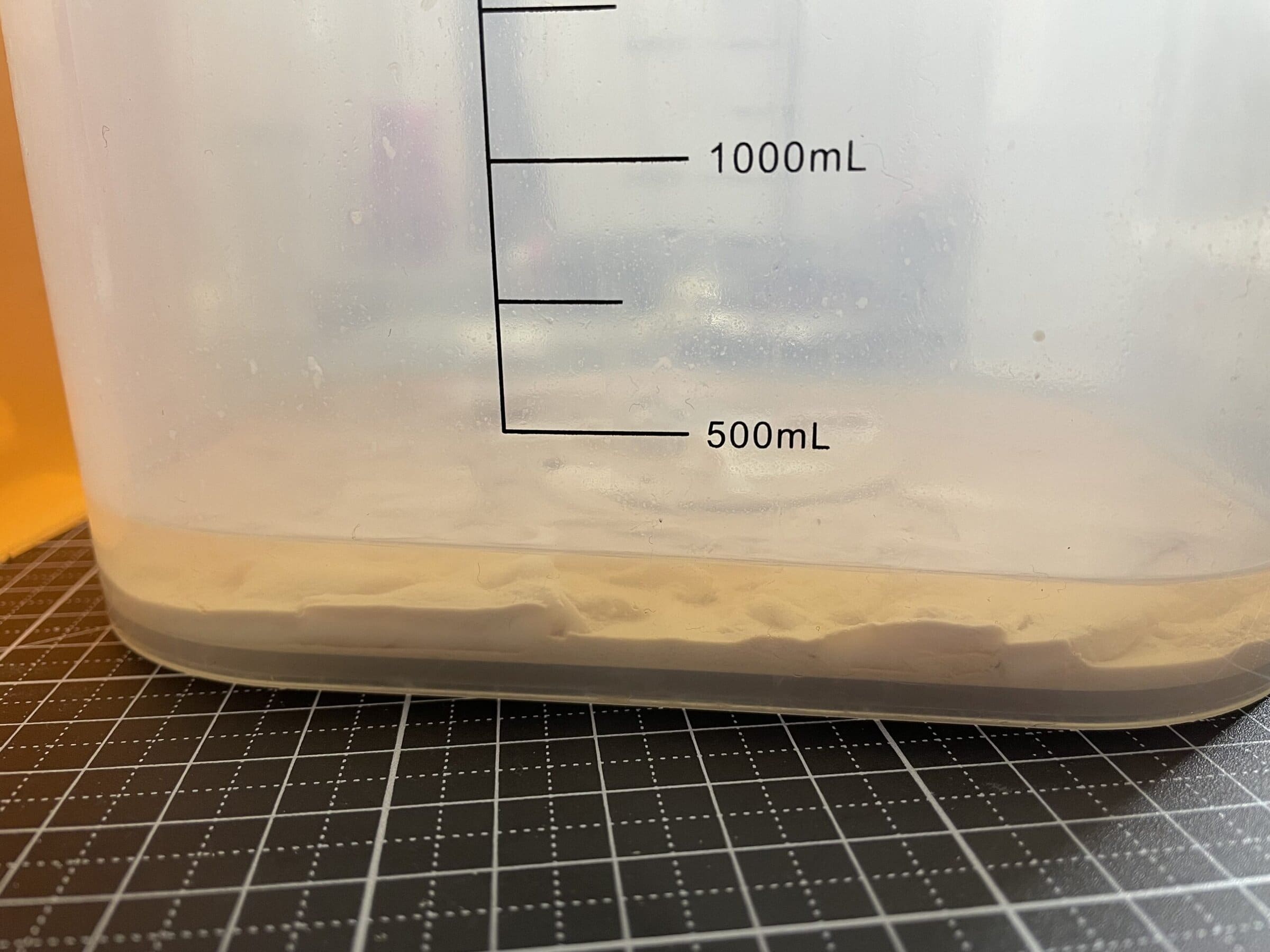Mein Restebehälter steht verschlossen und sonnengeschützt draußen. Dadurch bekommt das Gemisch zwar keine direkte Sonne, aber dennoch etwas UV-Licht. Bleibt der Behälter so über Wochen stehen (Zeitraum bis zur nächsten Reinigung), setzt sich das Resin deutlich fester am Boden ab. Das oben schwimmende Iso lässt sich so fast vollständig abkippen, ohne dass sich der darunterliegende Matsch mitbewegt. Pro Monat bleiben bei mir ca. 100-150g Reste übrig, die nicht mehr wiederverwendet werden können.