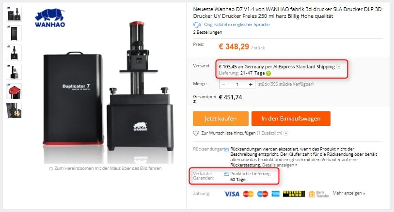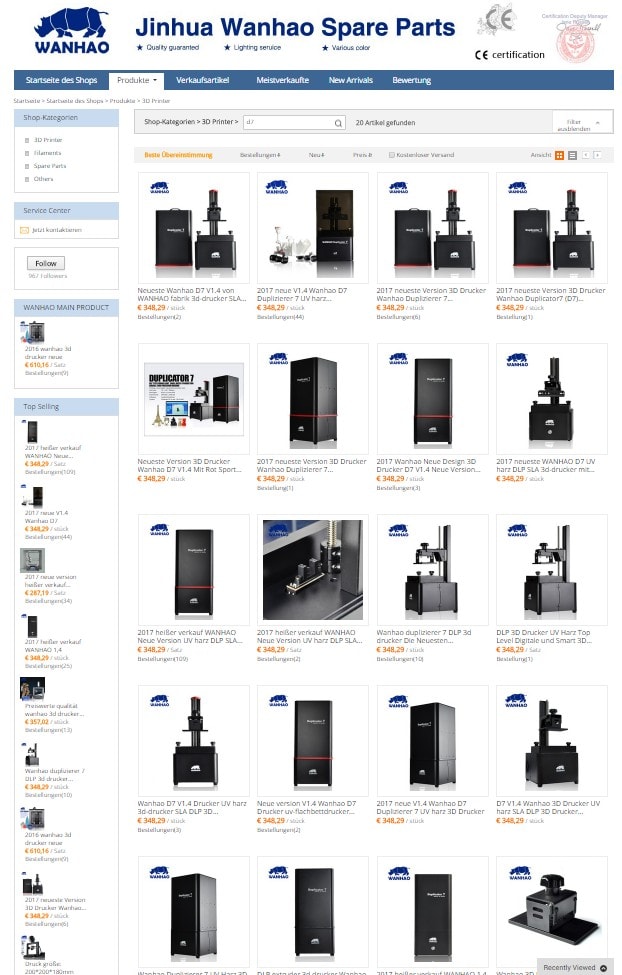 Wanhao ist selbst als Händler auf AliExpress vertreten, das ist nicht das Problem. Das Problem ist, Wanhao bietet den Duplicator 7 in über 30 unterschiedlichen Versionen an, mit immer der selben Beschreibung und dem selben Preis, augenscheinlich ändert sich ab und an mal das Bild. Es gilt die Details zu beachten
