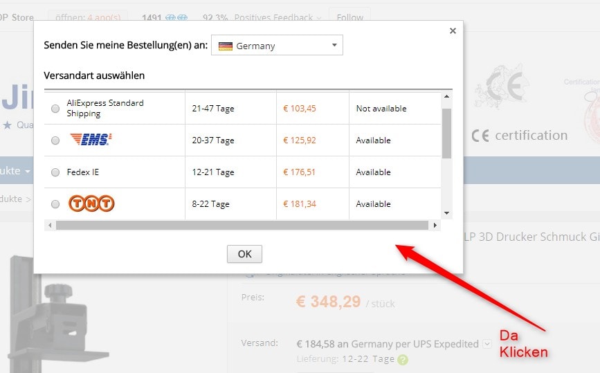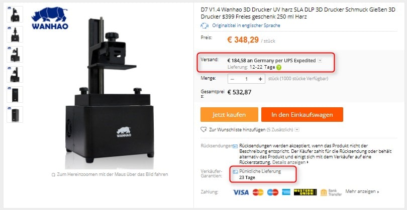 Alle durchzuklicken und teils anhand nur eines einzigen Stichworts im Kleingedruckten die Unterschiede rauszufinden ist etwas.. anstrengend. Wer die Varianten aufmerksam studiert, kommt aber früher oder wie bei mir später auf den Trichter: der Unterschied sind die verschiedenen Frachtdienstleister, Versandkosten und die „Garantiezeiten“ (daneben gibts den Drucker auch noch mit und ohne 250 ml Kunstharz).