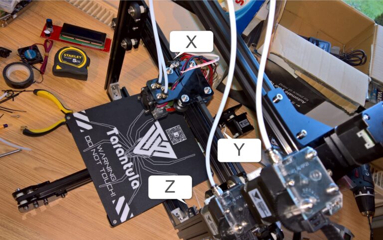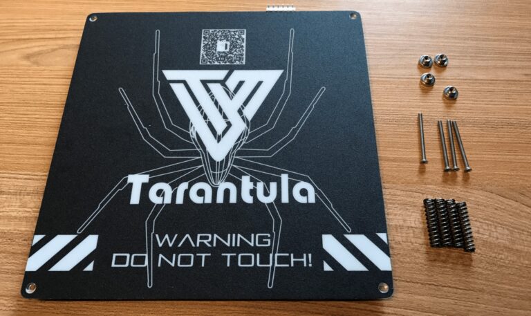Kritik: In der Praxis muss ich leider feststellen, gerade in Y Richtung ist der Rahmen des Tarantula alles andere als steif, das ganze gibt mehrere Grad nach vorne / hinten nach. Das ist ein bissl enttäuschend. Obs Auswirkungen auf den Druck hat, werden wird sehen müssen.
