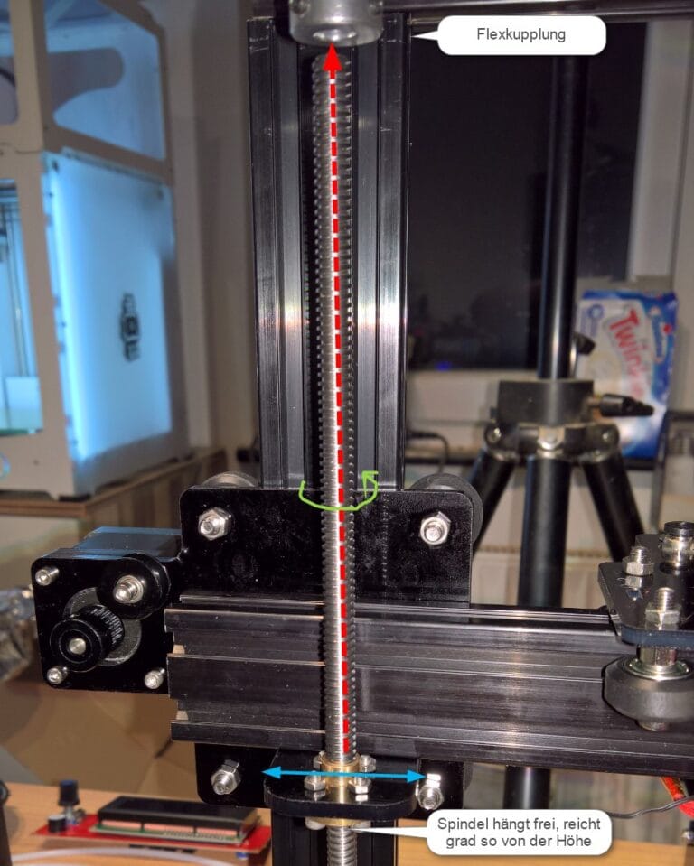 Ich habs für mich ein bissl abgewandelt: Ich richte den Motorhalter so aus, dass der Motorschaft inkl. montierter Flexkupplung möglichst parallel mir der rechten der 2 Nuten läuft. Dann wie im Video den Schlitten auf halber Höhe festbinden. Die Trapezmutter montieren und Spindel eindrehen. Nun solang rumschieben, bis die Spindel während sie frei hängt exakt mit der selben Nut in einer Flucht steht und beim Hochdrehen dann in den Flexcoupler rutscht. Madenschrauben anziehen und gut ist. Hoffentlich. Noch hab ich keinen Druck. Elektronik ist noch nicht montiert.
