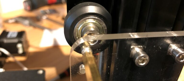 Tipp: Beim Anziehen der Schrauben für die Rollen immer mit so etwa der selben Kraft ran, damit die halbwegs gleichmäßig hoch werden. Auch mal auf die Schraubköpfe stellen und gucken obs kippelt. Ich nutz nen kleinen Proxxon Drehmomentschrauber auf 1NM das machts einfacher, die Dinger sind jedoch nicht günstig (aber praktisch – auch zum Düsentausch, auf Thingiverse gibts einen zum Ausdrucken, „Torque Wrench“ heisst das Ding)