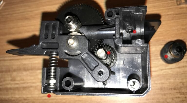 Der Zusammenbau ist relativ simpel: Zuerst die kleine Schraube am oberen Rand des Titans im Bild oben lösen, dann kann der transparente Deckel runter.  Dann steckt ihr das kleine Zahnrad in der Bildmitte auf den Schaft des Steppers. Und zwar so weit runter dass er wie im nächsten bei (1) bündig mit dem großen Zahnrand steht