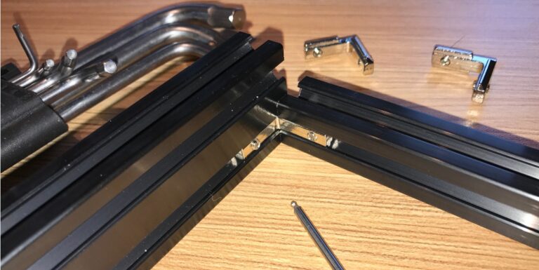 Nachdem das Malheur behoben ist, wird das letze Profil oben als Querbalken mit 2 weiteren Innenverbindern aufgeschraubt. Prüft durch Verschieben entlang der Z-Ache, dass das alles halbwegs rechtwinklig ist – oder besser noch, haltet nen rechten Winkel dran, so ganz so schön geradeziehen tut sich das mit diesen Mini Verbindern eben auch nicht. Mal gucken, ob ich da nicht noch ne bessere Lösung finde. Knallt das noch nicht zu 100% an, da kommen ja noch Acryl-Winkel und so Zeug ran.