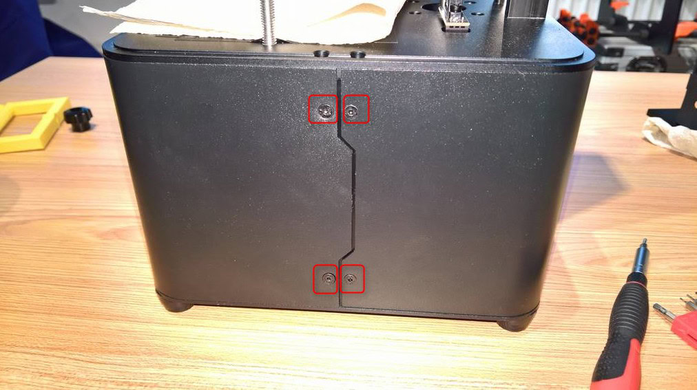 So, nun können wir die 4 Schrauben für den Deckel lösen, 2 auf jeder Seite. Vorsicht, haltet das Ding an der Z-Achse, das kippt sonst, sobald die letzte Schraube raus ist..
