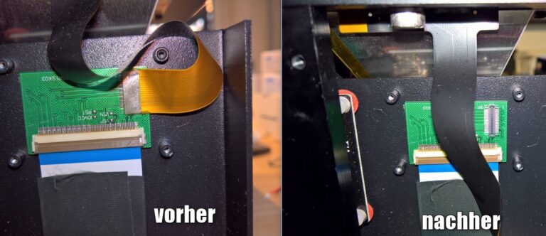 Am Gerät selber ziehen wir nun noch das Displaykabel ab, damit wir das nicht abreißen, wenn wir den Deckel oben abnehmen.